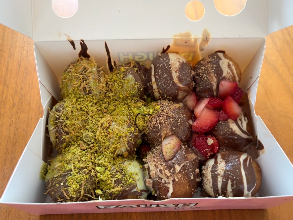 I walked over to Doughboy, which shares the space with Doughlicious. There are two young staffers who were hustling to keep up with orders. The doughnut holes are fried fresh right in front of you, then assembled to order. I went with two combos, Bueno Supreme (dozen, $11.99) and Dubai Chocolate (dozen, $11.99). The doughnuts are superb. The shell shatters on first bite, giving way to a warm, airy interior that tastes clean rather than greasy. It’s that combination of light dough and well-handled oil that sets them apart.