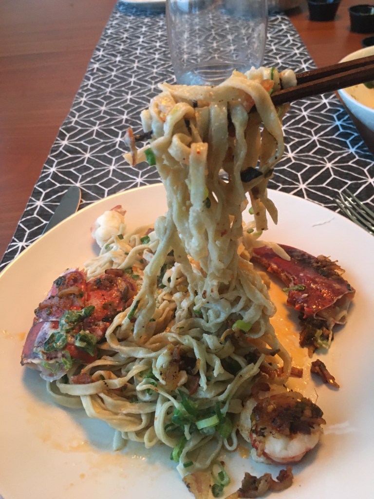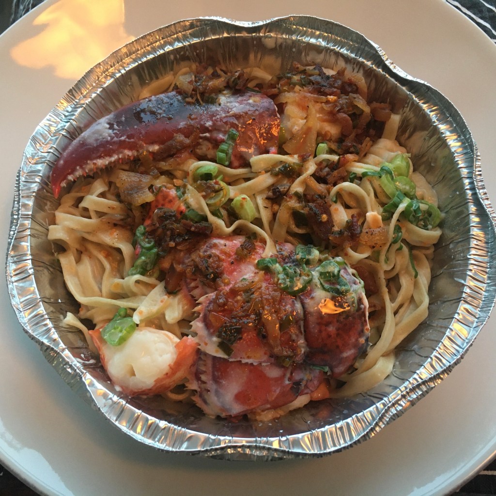 The lobster lo mein is a bougie Chinese version of spaghetti carbonara. Our individual servings contained big, firm chunks of sweet lobster. It took no effort to jiggle the meat out of the shells.
