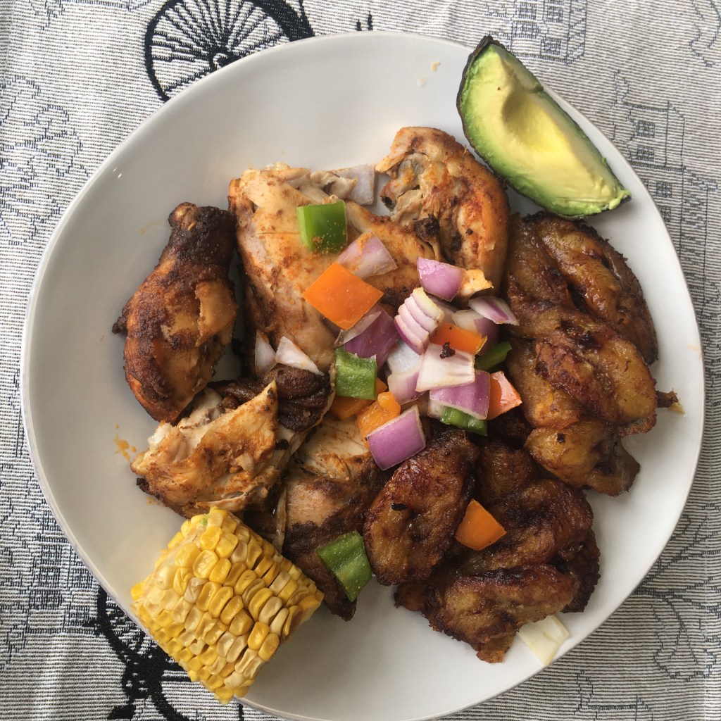 I wasn’t sure if there was a proper process to eating the side of avocado. So in between bites of rice and chicken, I’d take a scoop of avocado, or a bite of raw onion and bell pepper. The corn was a winner – sweet and covered in a juicy, buttery sauce.