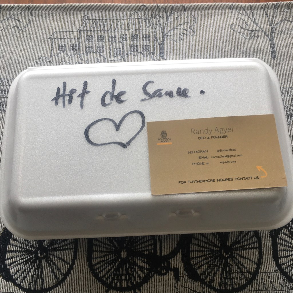 I sent a direct message on Zion’s Instagram and asked Randy what was on the menu for Friday. The feature was Ginger Jollof Rice and Suya Chicken ($20). Delivery for my neighbourhood was $10. If you live in the NE or the downtown core, delivery is only $5. Delivery for lunch is offered Thursday to Sunday. If you order from the catering menu, delivery is free with a minimum purchase of $100. Pro tip – both foodiegyal7 and 4jki recommend ordering from the catering menu versus the lunch special because you get more protein versus carbs. For payment, just e-transfer the amount to Zionsoulfood@gmail.com the day of.