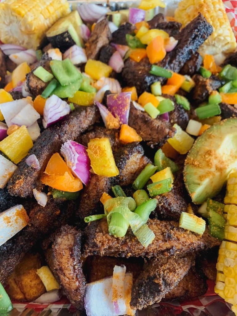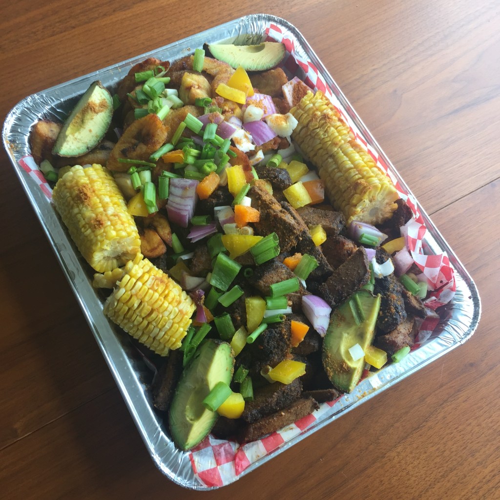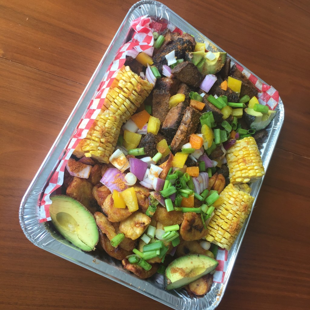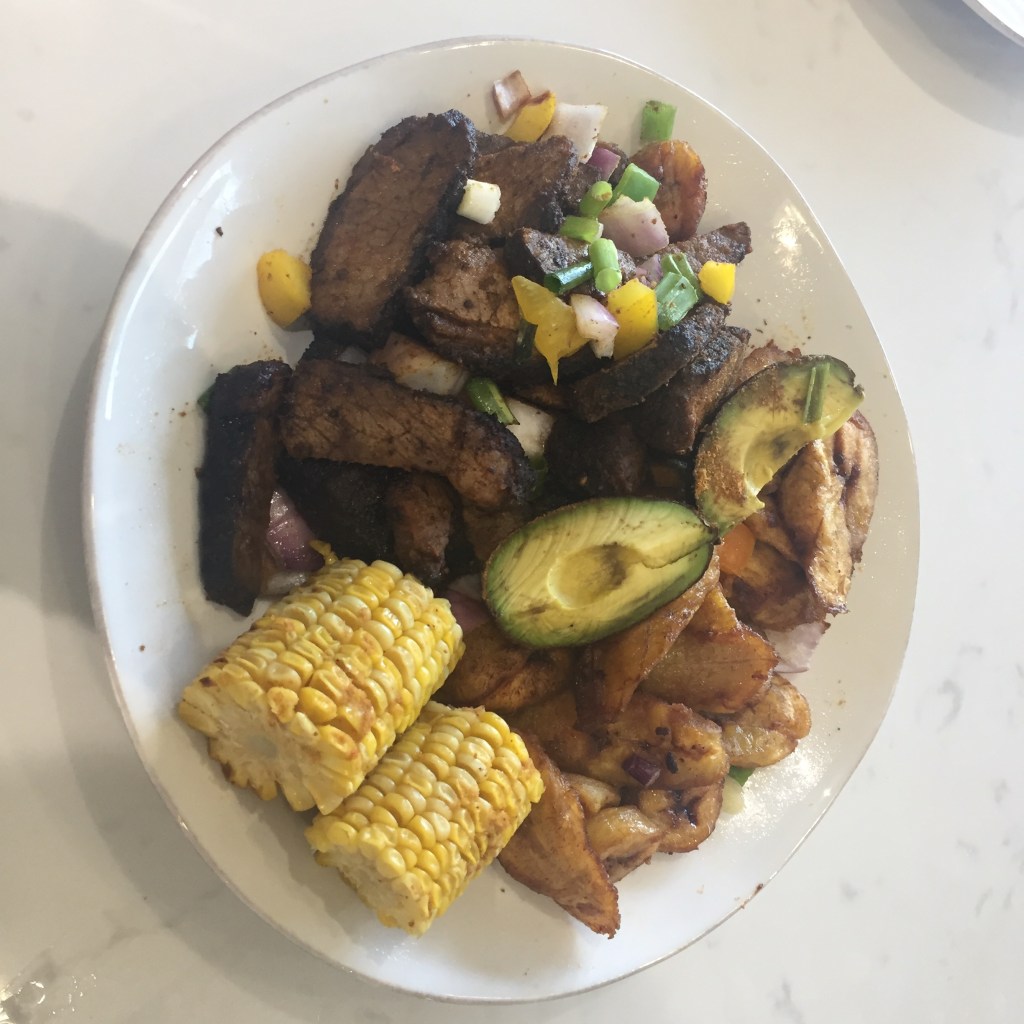 The platter was heavy, packed with seasoned slices of beef brisket, a mountain of plantain, four pieces of corn on the cob, and four slices of avocado. I could tell by looking at the platter that a lot of care was put into each item. The beef was covered in spices and even the avocado was sprinkled with seasoning.
