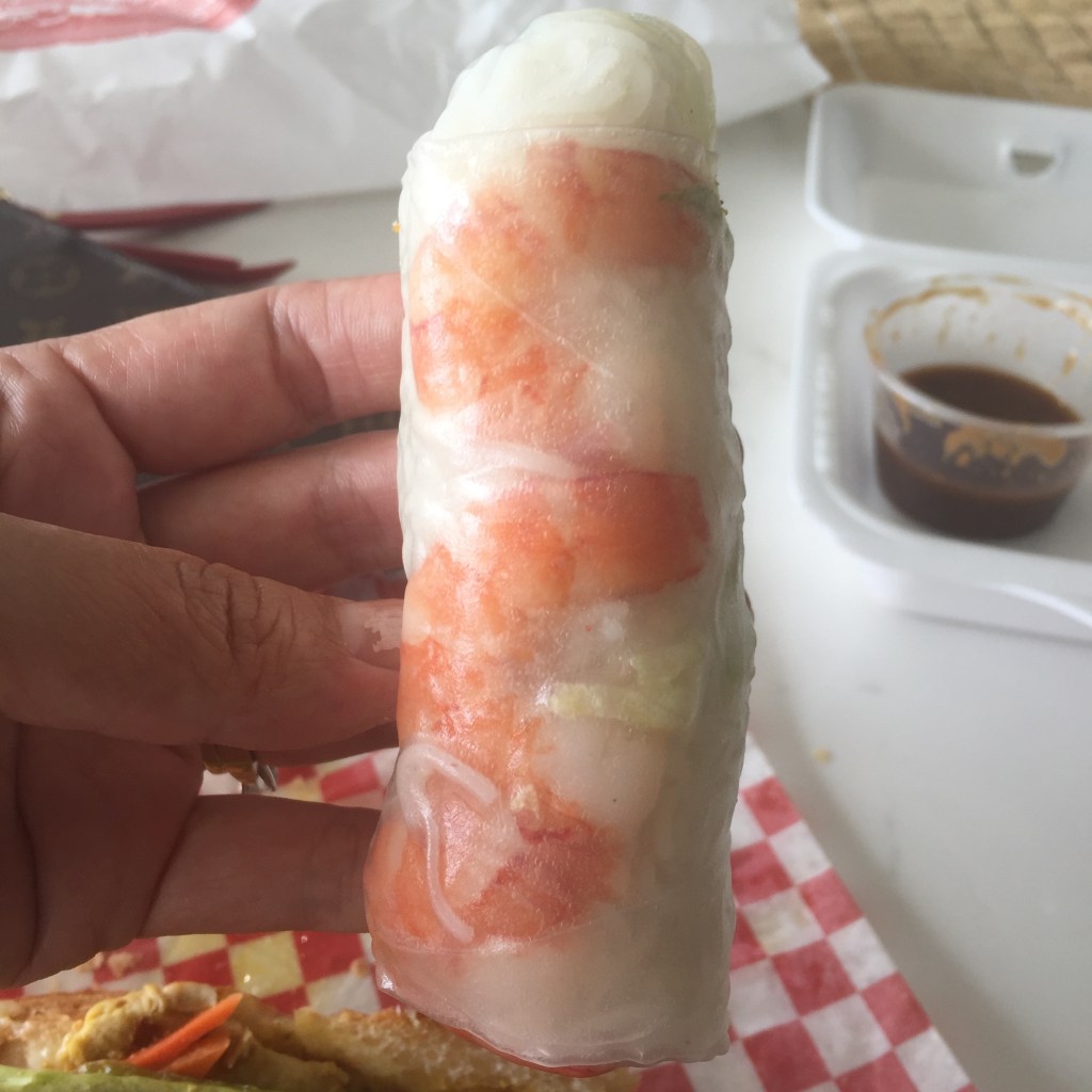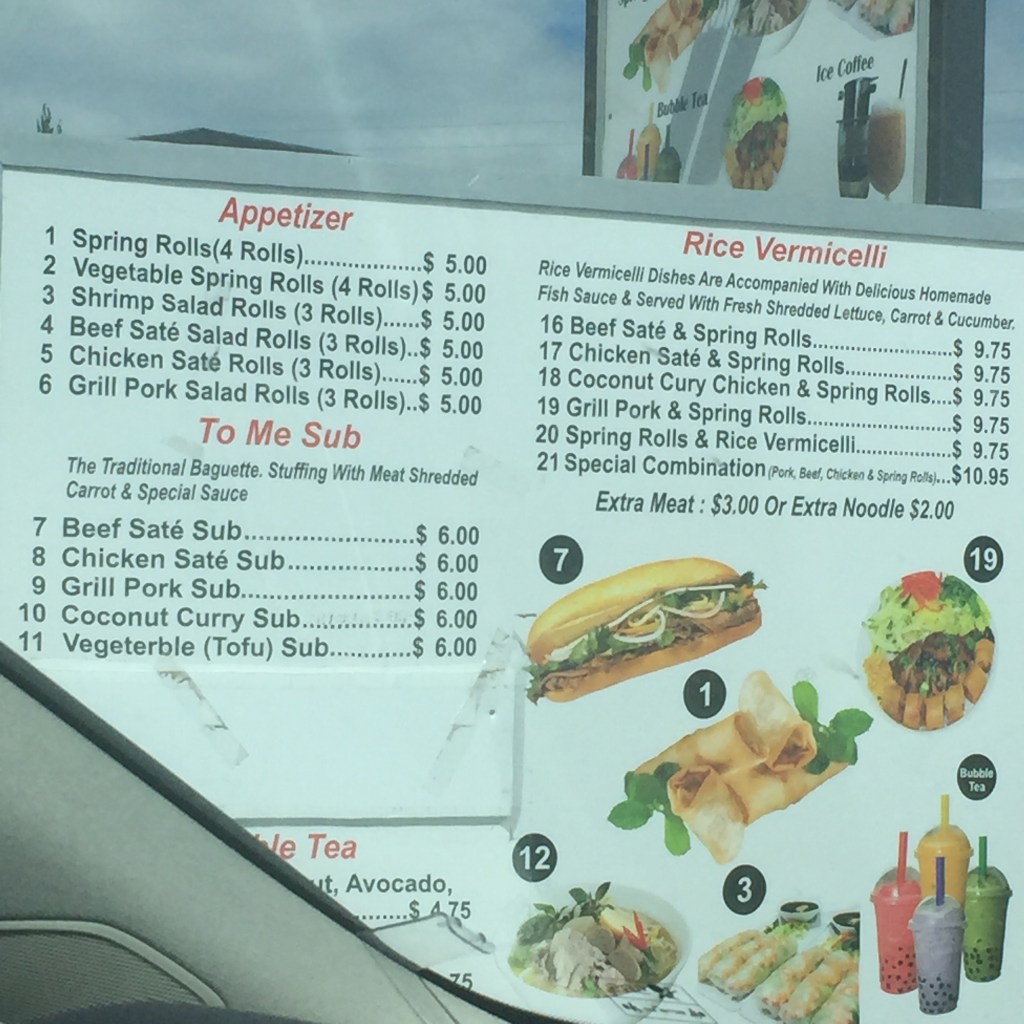 We were lucky. There was only one car ahead of us, so we waited less than five minutes. I ordered Shrimp Salad Rolls ($5), Mango Bubble Tea ($5), Satay Beef Sub ($6), and a Coconut Chicken Sub ($6).