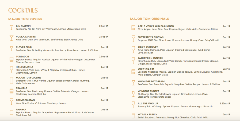 For our girls’ night out, Québécois, Kournikova and I went to Major Tom. It took me months to get this reservation. Currently, the restaurant is booked solid up to 2022, though I read on Wanda Baker‘s Instagram account that Major Tom keep 25% of tables open for walk-in. For this post, let’s listen to “Girls Just Want to Have Fun” by Cyndi Lauper.