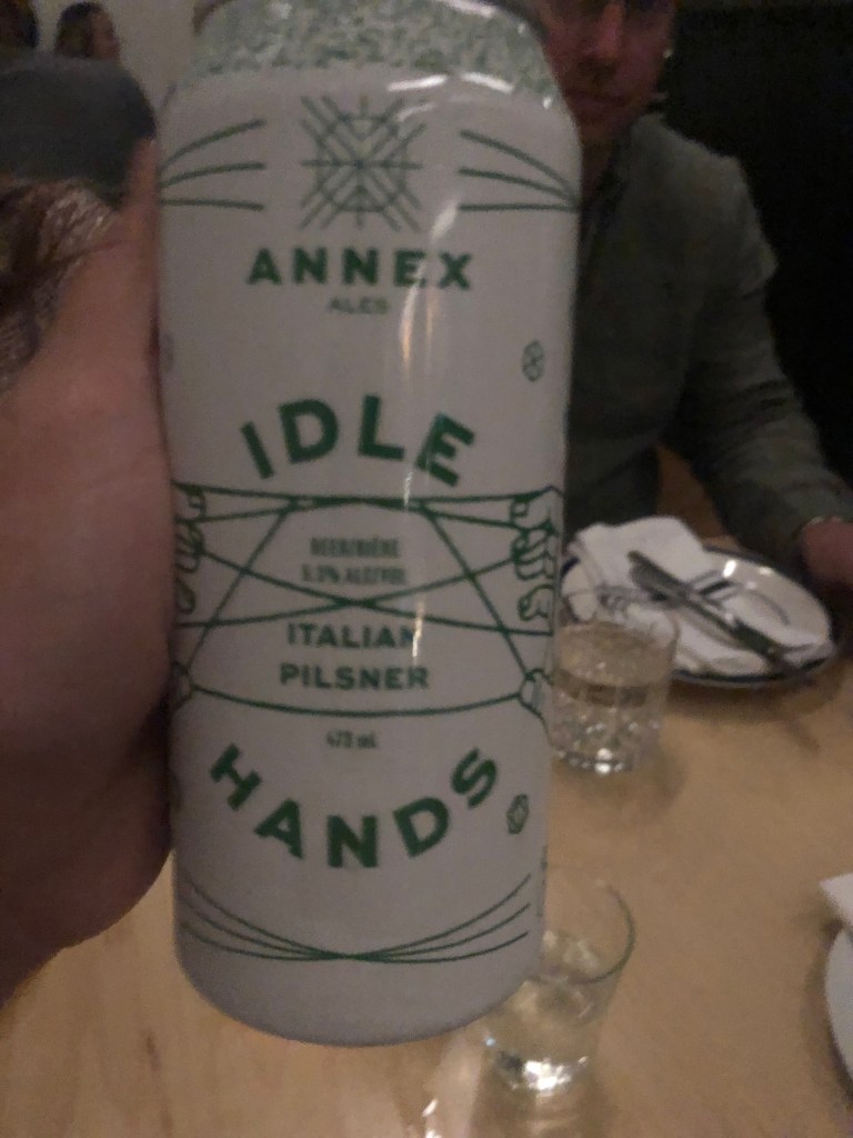 We began with a round of drinks. Glen Jr chose a beer from Inner City ($8), L picked an Annex Italian Pilsner ($8). Honesty ordered a non-alcoholic Negroni ($6), and I sipped on a flute of Lambrusco ($14). I found the pinkish sparkling wine light, clean and minerally. L enjoyed his beer, which he said tasted like Peroni but better.