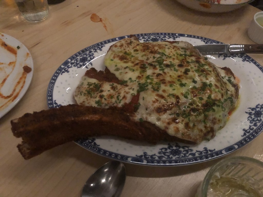 I loved how the Veal Chop Parm ($49) arrived in this impressive, super-sized portion. The exterior was crunchy and sizzling hot. The veal itself was tender, blanketed in a heavy layer of melted provolone cheese. As I gnawed on the bone, I could feel the shards of the batter shatter and land in my hair. I’m not a dainty eater.