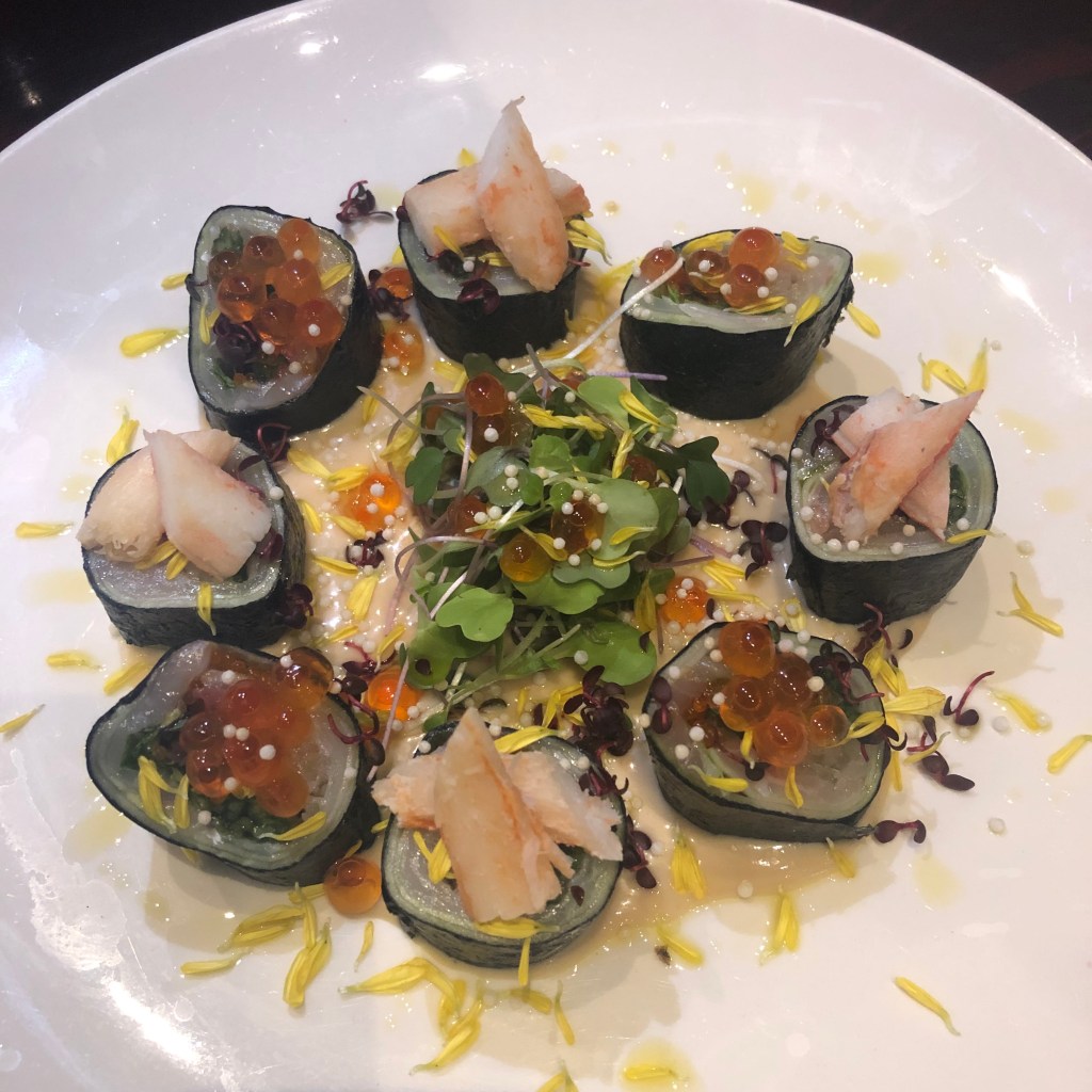 Head chef Koji Kobayashi sent over a stunning gift for L’s birthday – seabass and snow crab sushi. L and I just sat there a moment in silence – admiring the food art. I didn’t notice there was an absence of rice until L mentioned it to me. The silky texture of the fish on fish was sublime. The creamy sauce tasted like roasted sesame seeds with a touch of sweetness. I loved the sea burst pop of the salmon roe and the crunchier snap crackle of the tobiko. I was smiling the entire time I ate. I never experienced this flavour and texture combination before. This dish was incredible – the best thing I’ve eaten in 2021. I thought the seabass sushi illustrated Koji’s wide range of creative talent. After sampling Chef Koji’s specialty dishes in the past few years, I can say he has multiple platinum hits and not a one-hit-wonder.