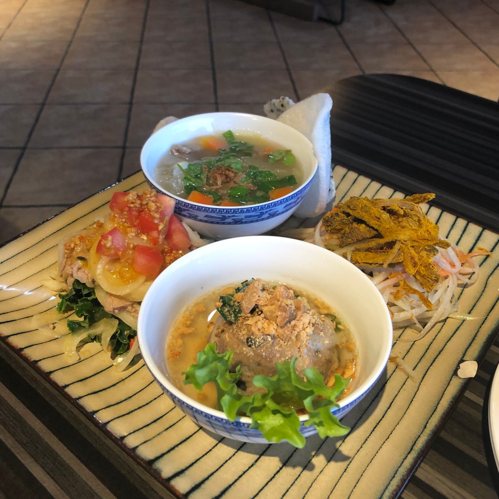 The cold, wet papaya salad with beef jerky was a wild explosion of sour and tart notes. The dressing on the strands of bean sprouts, papaya and carrots were refreshing. The lime-marinated medium-rare beef salad offered lively bites from the crunchy slices of onion, balanced by the mellowness of the chopped tomatoes. I also enjoyed snacking on the shrimp crackers, which were light, crispy and melted in my mouth.