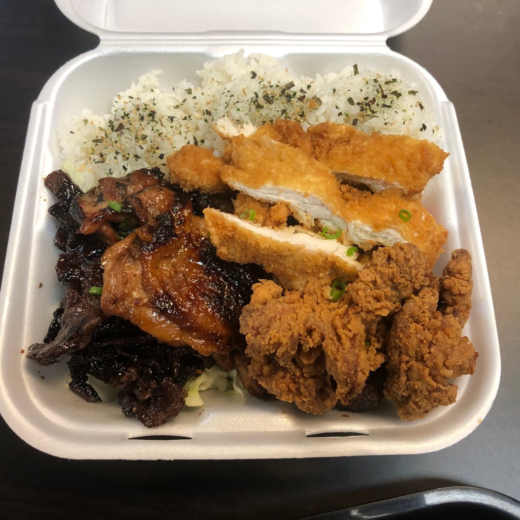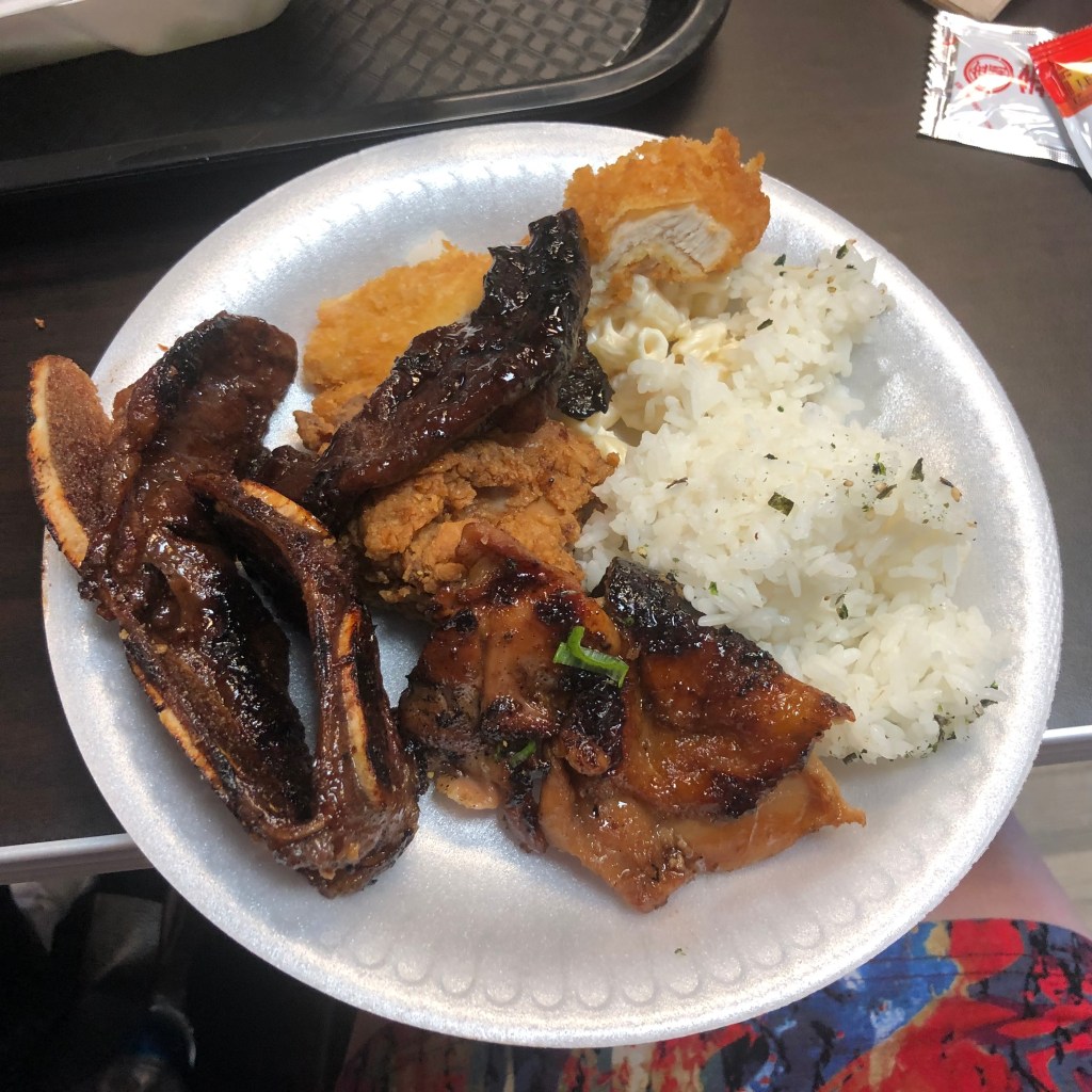 Twenty minutes later, our platter was ready. What a bounty of gluttony! All the meats were so hot that I burned my greedy little fingers eating too quickly. Our BBQ platter included two big scoops of rice sprinkled with furikake and a small container of macaroni salad.