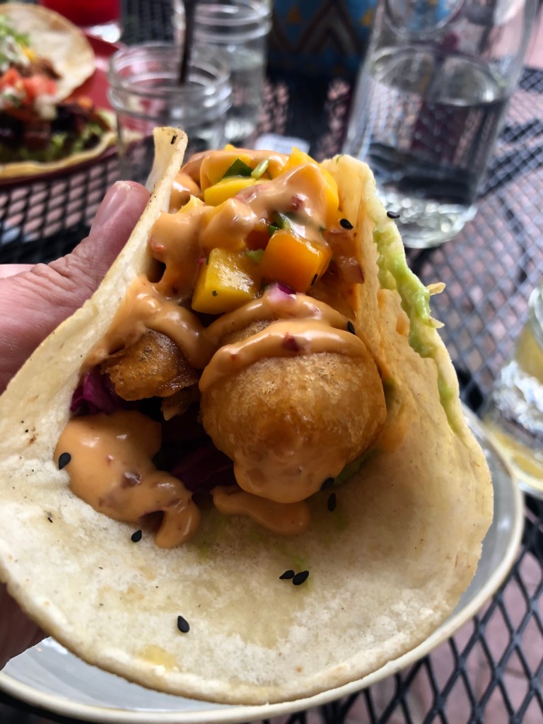 I ordered two tacos. The No-Fish taco ($5) consisted of beer-battered palm hearts. The smooth, buttery texture and taste mimicked white fish so well that I couldn’t tell it wasn’t fish. I also enjoyed the burst of flavour from the ripe mango and sweet corn garnish. This taco is a winner.