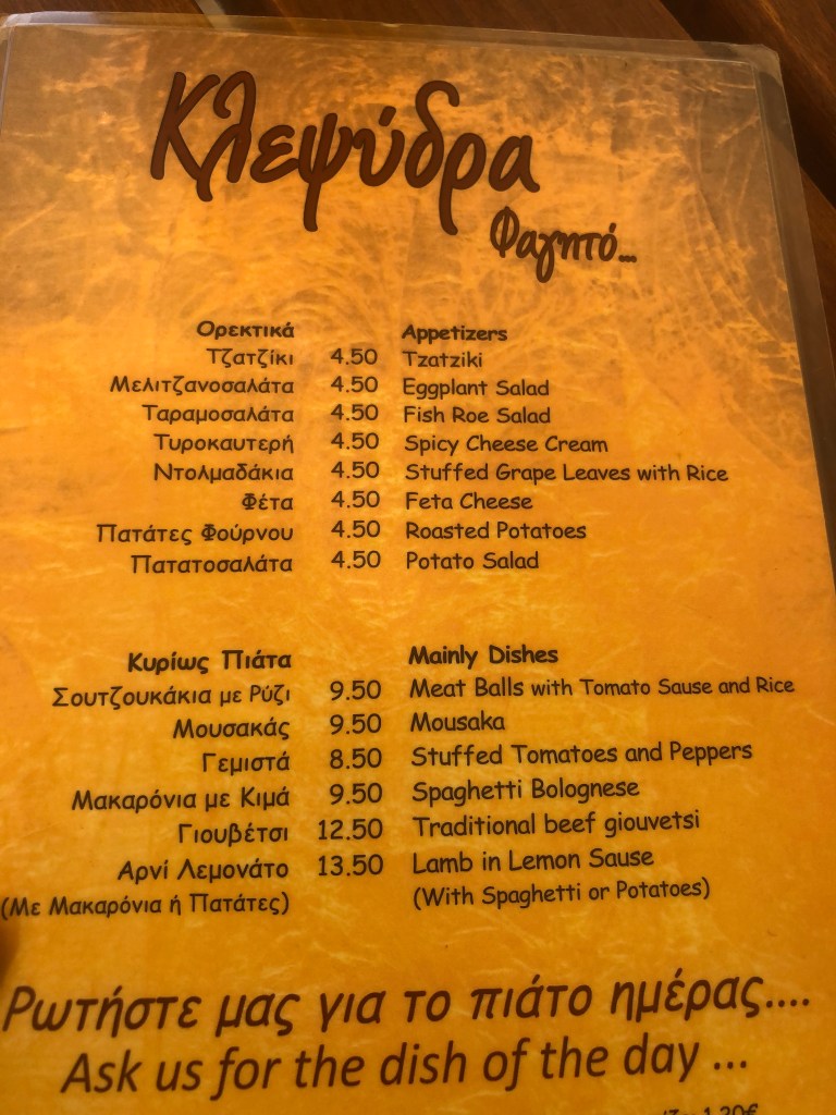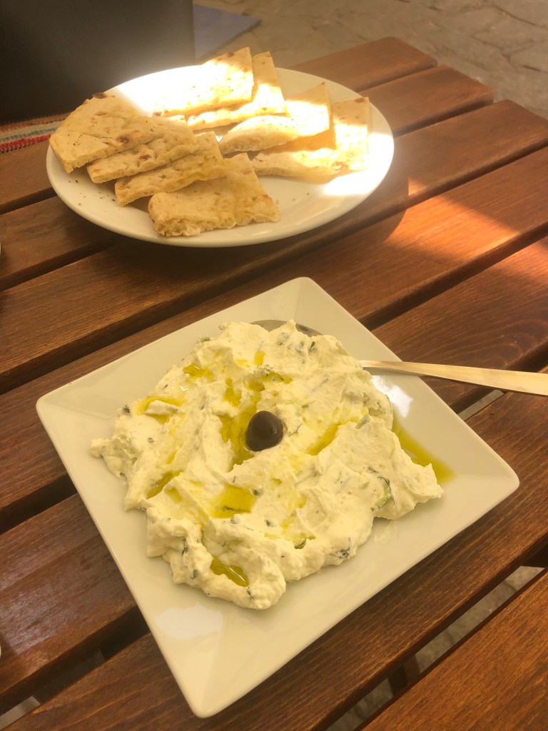 We picked a spot in the shade and ordered two appetizers and a Mythos beer. I never liked yogurt until I tried it in Greece. The tzatziki (€4.50) has a thick, dense velvety texture and a fresh, light flavour. Our dip was zesty and herby from the dill and cucumber, the perfect foil to the warm, salty pita bread.