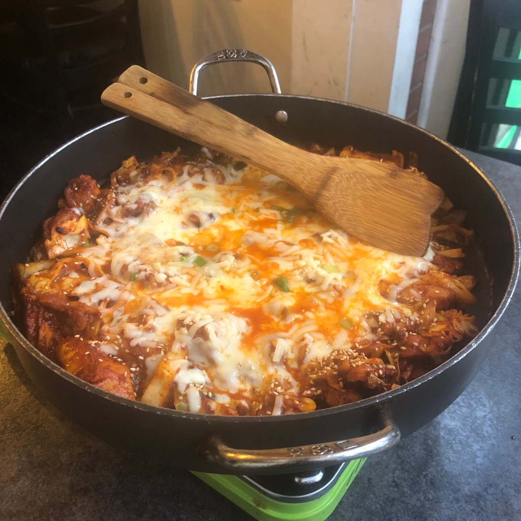 I was excited when a big skillet full of spicy stir-fried chicken arrived at our table. Our server turned on the burner. We watched patiently as the cheese melted over the chicken, sweet potatoes and rice cakes. L noted the chicken was of good quality. I didn’t find the sauce spicy, though L could detect some heat. I liked how every time we went to scoop a piece of chicken or rice cakes, the strands of cheese would stretch from the skillet to our bowl. When grilled, the rice cake was chewy and gelatinous.