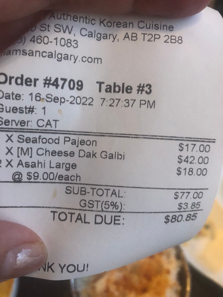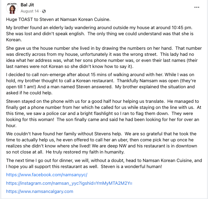 I wanted to check out Namsan Korean Cuisine. I’ve heard only good things about the food, but a Facebook Calgary Roast and Toast inspired me to dine here, detailing how the owner of Namsan went out of his way to help a stranger in need.