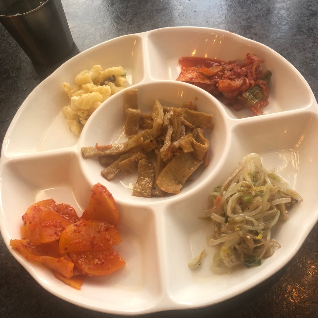 Of the bunch, our favourite side dish was the sweet pickles. The texture was unique – crunchy yet bendy. The kimchi was red and wet from the spicy seasoning. I found the julienned fish cakes sweet and chewy. The chilled sprout and macaroni salad were standard.