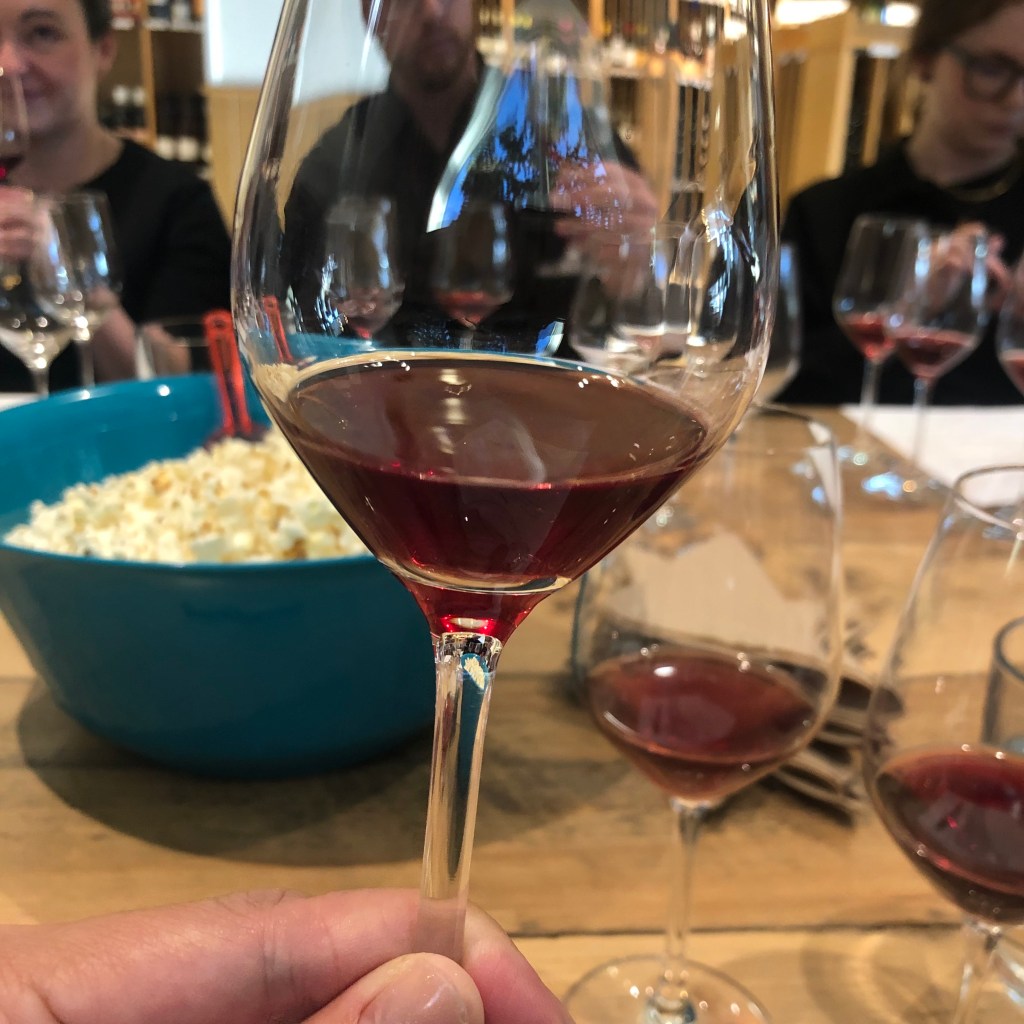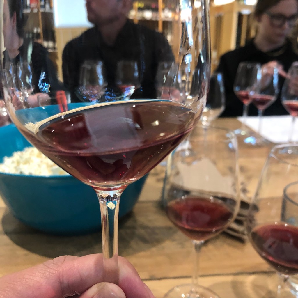 The sixth bottle we sampled was Ca Se Discute Pineau d’Aunis ($37.95). I smelled raisins. Turned tasted Dr. Pepper. Her neighbour Coke said he could taste cola. Erik described this wine as peppery with pomegranate, and he could envision eating this with salami on the steps of a cafe in Paris. Turned joked that this wine would pair perfectly with a cigarette.