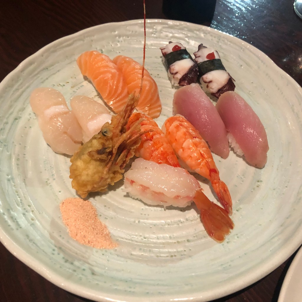 Chef Koji Kobayashi slayed the presentation – the multi-coloured roes, ruby-pink fish, yellow petals, and purple and green greens sparkled in the light. What a beauty! Judith suggested a creamy sake to pair with the carpaccio. The mouthfeel of the sake was so sensual, with soft fruit and floral notes.