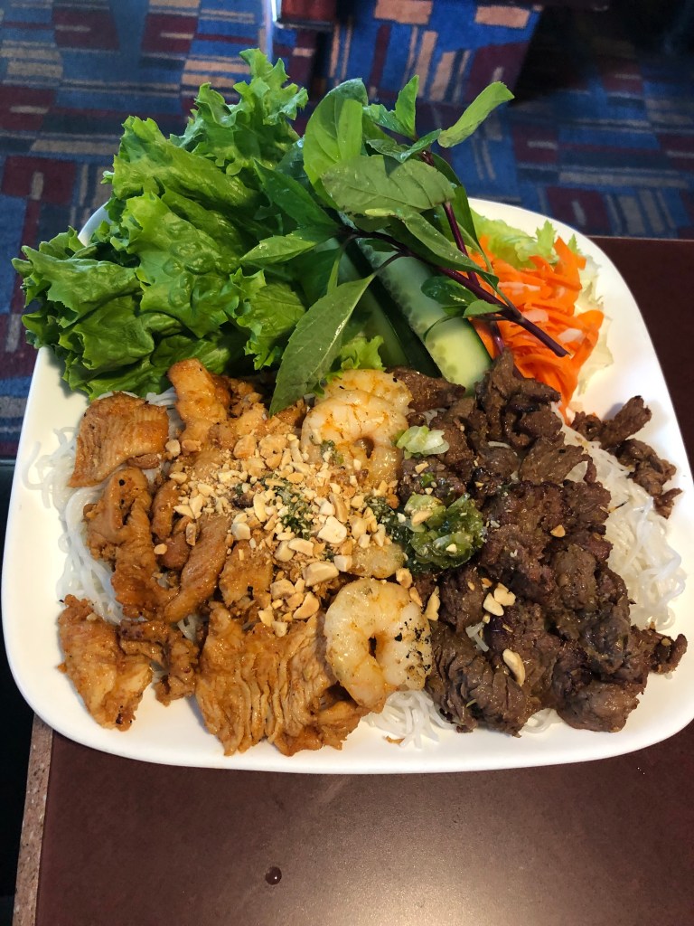 You can pick various combinations for the wrap and roll platter. We chose the special prawns, lemongrass chicken, and sate beef. Our plate contained a heaping pile of glistening vegetables: romaine lettuce, basil, carrots, onions, and cucumbers. The vermicelli was laced with crushed peanuts and cooked green onions. The noodles were noticeably springy, with a jiggly mouthfeel. If you like Cuty’s wrap and roll combo, you’ll love Pho 99’s version.