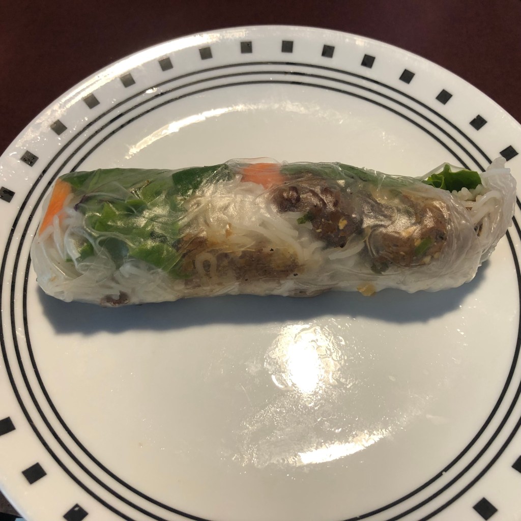 The pork spring rolls were hot, crunchy, and slender, resembling Romeo Y Julieta mini cigars. I could see minced carrots and noodles in the creamy filling. The nuoc cham (dipping sauce) wasn’t overly sweet, and the smell and taste of fish sauce were subtle.
