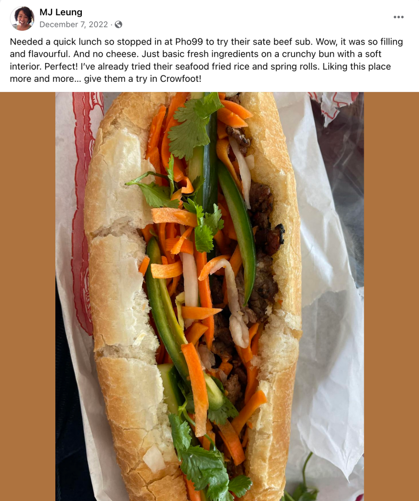 Historically, L and I disagree about who makes the best banh mi in Calgary. It seems fitting that we finally agreed on February 14, 2023, that Pho 99 makes our favourite beef sate sub. Lightly toasted, the bread is soft enough that your teeth sink in without scraping the skin on the roof of your mouth. L liked there wasn’t an abundance of mayonnaise or sweet sauces. Instead, the beauty of this sub was how damn good the beef taste – generously layered, charred and smoky from the wok.