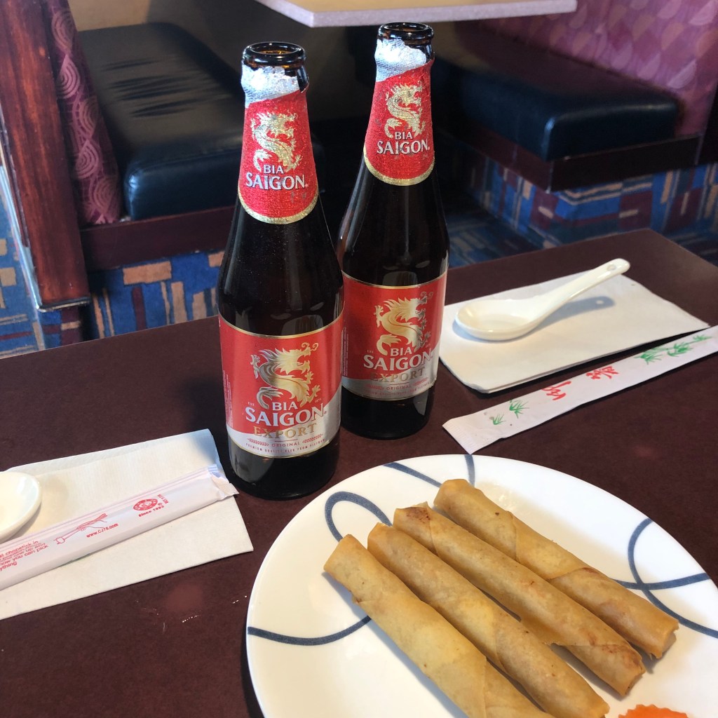 We requested two Saigon beers ($7.50), Deep-Fried Pork Spring Rolls ($8.25), Self-Wrap Rolls ($19.25), and a Grilled Lemongrass and Sate Beef Submarine ($9.95). After we ordered, I spotted the number four at our table, which is bad luck in Chinese culture. Whoops. Good thing I’m not superstitious.