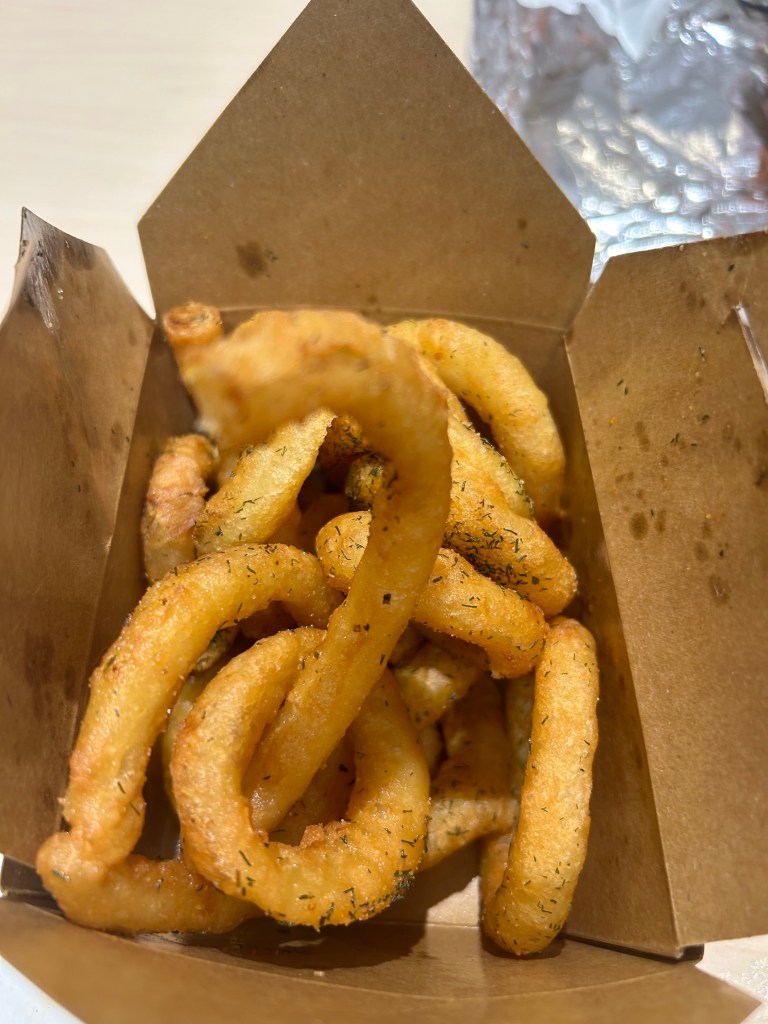 Most of us ordered the signature burger, The Flipp’n ($15.75). I opted for Onions Rings ($5.95) with garlic aioli. The batter on the onion rings was crisp and puffy. Since we ordered delivery, the onion rings were cold and a tad greasy. I preferred Sharon’s deep-fried pickles. The thin coating was still crispy, while the pickle was still warm and juicy. The garlic sauce was pungent, with more minced garlic than aioli. The flipp’n sauce was creamier with a strong smoky flavour. Next time, I’d order something simpler, like ranch.