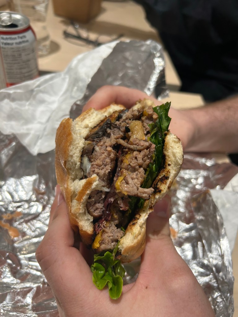 We were all wowed by our burgers. The beef was charred and crusty on the outside. The smell and flavour of the ground beef were intense, and the texture was somewhat dry with a nice chew to it, like a coarse sausage. The double patties were hefty pucks glued with melted cheddar and Swiss cheese. Each ingredient was generous and high quality, from the sauteed mushrooms to the thick-cut bacon.