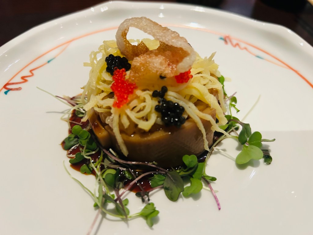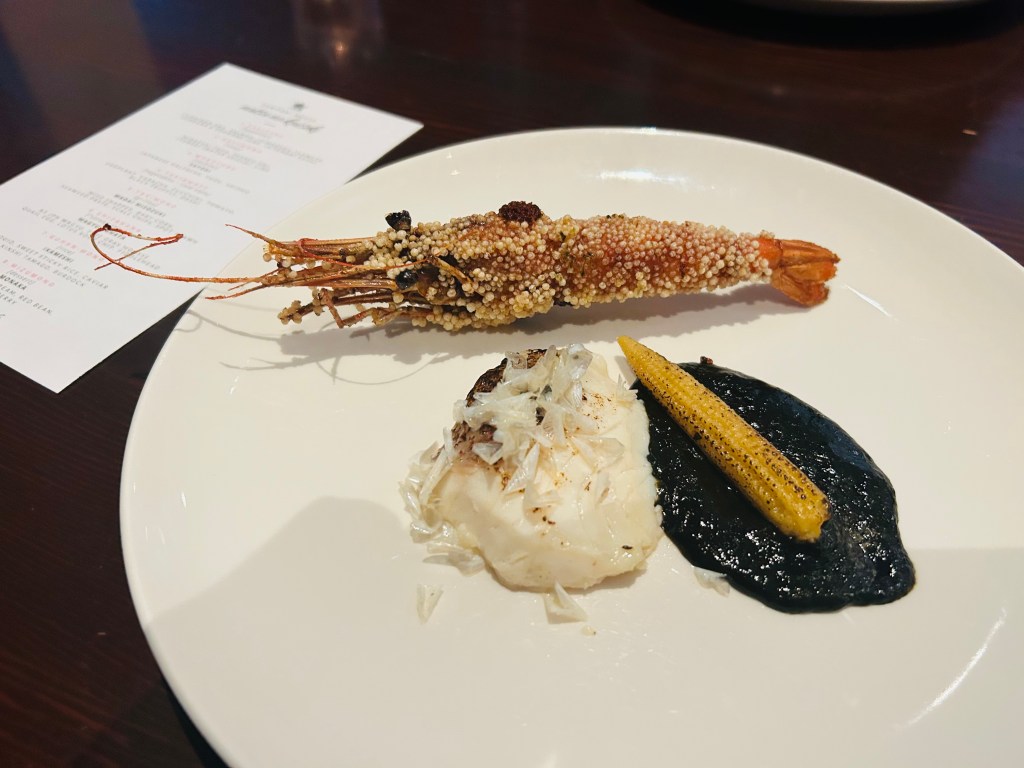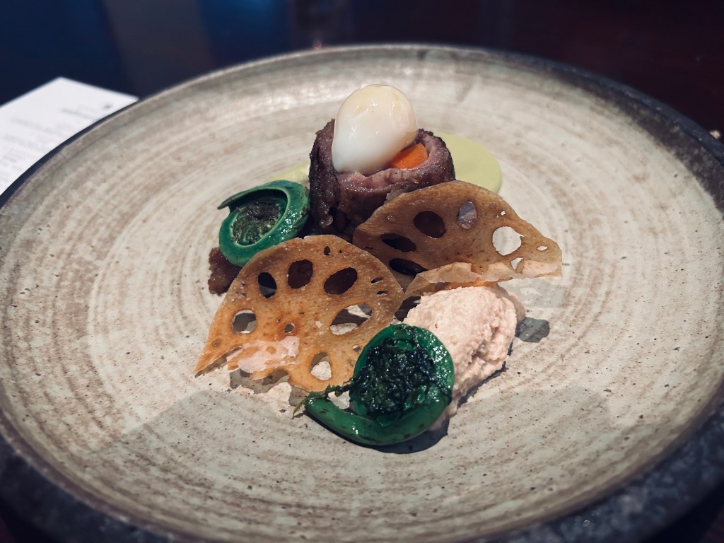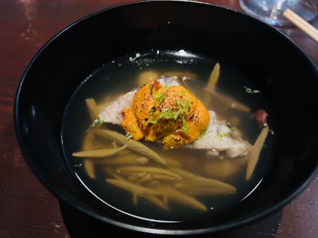 Before our shizakana course, we could smell the grounding fragrance of burning wood. I noticed the classical Japanese music was curated to each course at a volume low enough that my Shazam app couldn’t detect. Our plate of A5 Japanese Wagyu was decorated with a quail egg, foie gras mousse, lotus root chips and emerald-green fiddleheads. The foie gras melted in my mouth like whipped cream, salty and full of umami. Judith paired this dish and the next one with Terada Honke, Junmai.