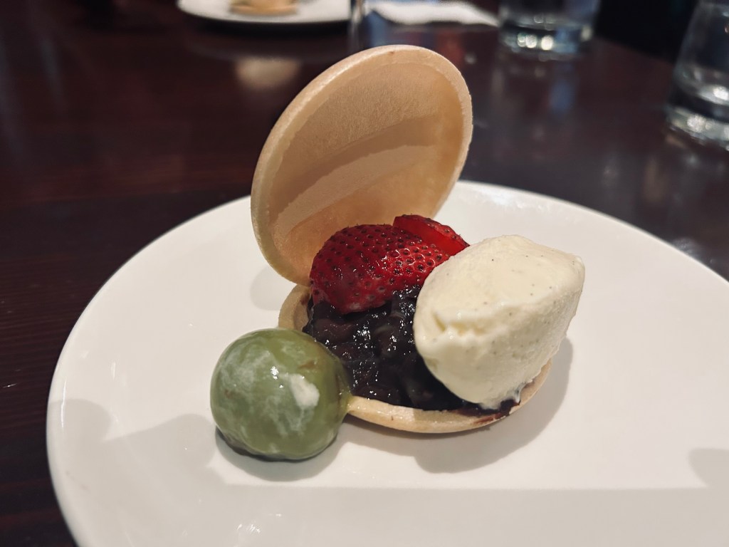 The final course, mizumono, was a fun way to end the series. The vanilla ice cream was sandwiched with red beans and strawberries. Koji said the red beans would ward off evil spirits. When I saw how much L enjoyed his dessert, I gave him mine to eat as well. I loved the pairing drink, hojicha infused sochu, a concoction of tea, cold brew coffee and Kahlua.
