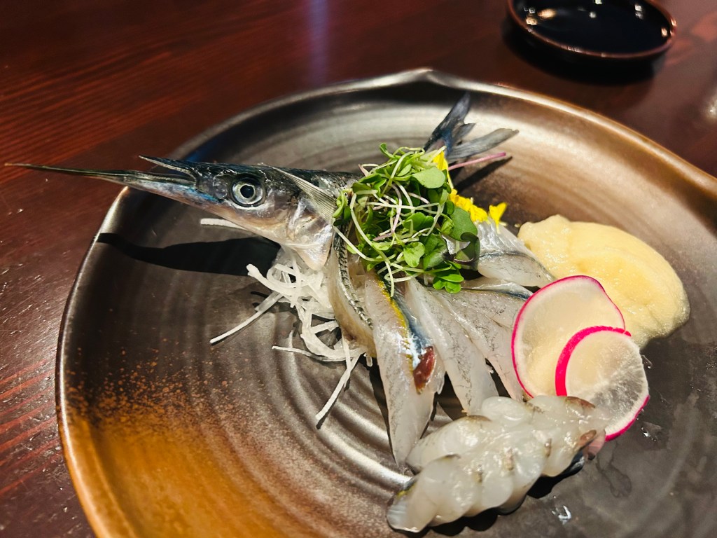The munkozuke was a showstopper, Japanese halfbeak with yuzo and shiso. Twisted in circle, the spine of the whole fish encircled the sashimi. L loved the showmanship of knife skills and the freshness of the sashimi. The yuzu foam was dreamy, a fresh and gentle complement to the delicate, clean white fish. The soy pairing was familiar, and the contrast made the flavour pop. Judith paired the sashimi with Senki Muku, Junmai Daiginjo.