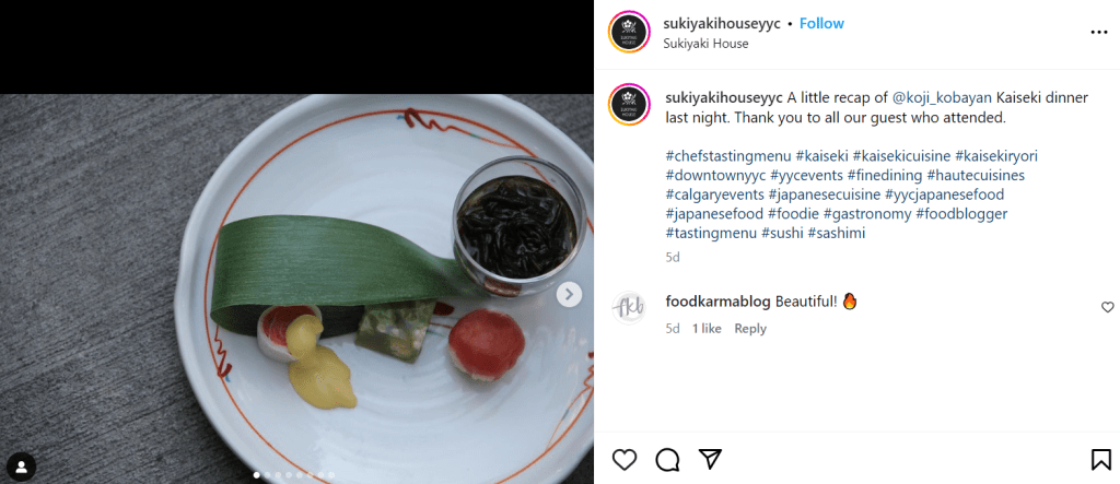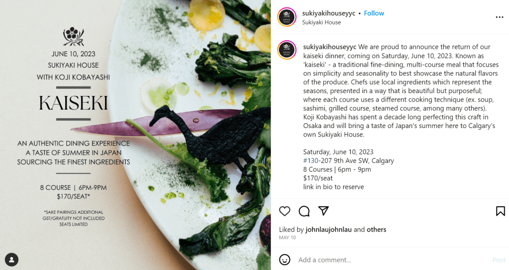 L and I added the sake sommelier pairings ($60), comprising 15 ounces of alcohol to match with Koji’s seasonally influenced eight-course meal. Our photos do not do the food justice. Check out Sukiyaki House’s Instagram photos to get a sense of the caliber of the presentation of the dishes.