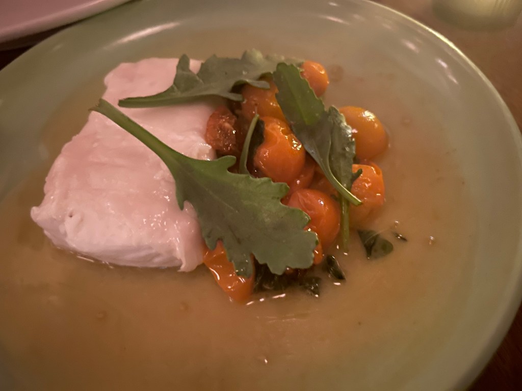 We arrived on time and were seated on the patio behind the restaurant. Our server steered us to a stellar natural organic Spanish wine, Vernatxa Instint Primari Friasch, from Terra Alta, Catalonia ($91). This white wine was the best bottle we tried on the entire trip. I found it textured, light and fresh, with a refreshing acidity. This wine was so good, I drank every single drop in my glass.