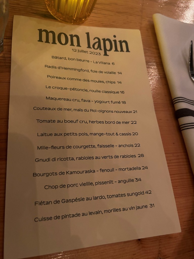 Obtaining a reservation to Vin Mon Lapin, Emerald’s suggestion, took a lot of work. Recently rated #1 of Canada’s 100 Best Restaurants, no openings were available even though I tried to book the day the spots were released. After several failed attempts on their waitlist, I did manage to snag a 9:45 pm on Wednesday.
