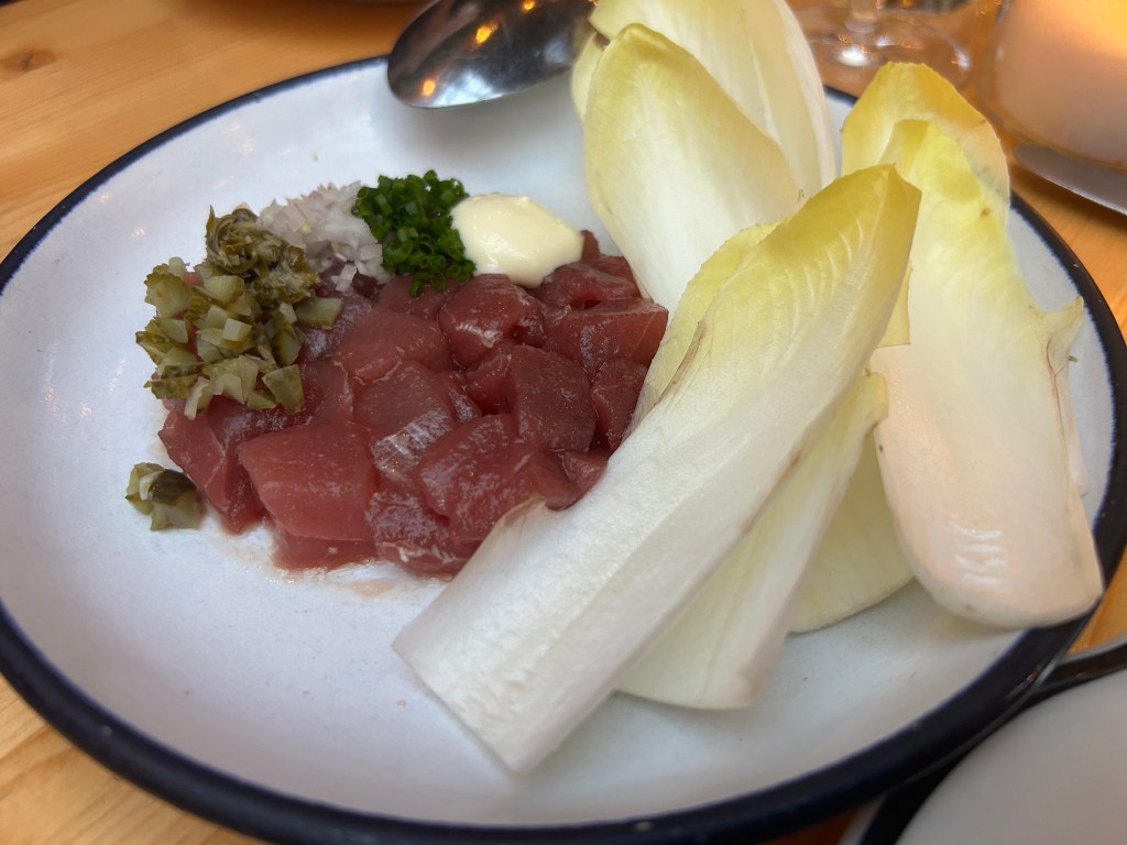 We picked our food based on the server’s recommendations, which included: Thon de La Gaspesie Tart ($25), Petoncle Cru ($48), Gnocchi Fritti Anguille ($16), Jambon e le Petite Bourg ($17), Mitake aux Champignons ($26), Belles Tomatoes ($15), Calamars, escarole, tomato ($19) and Tarte Clafoutis aux Ceris ($16).