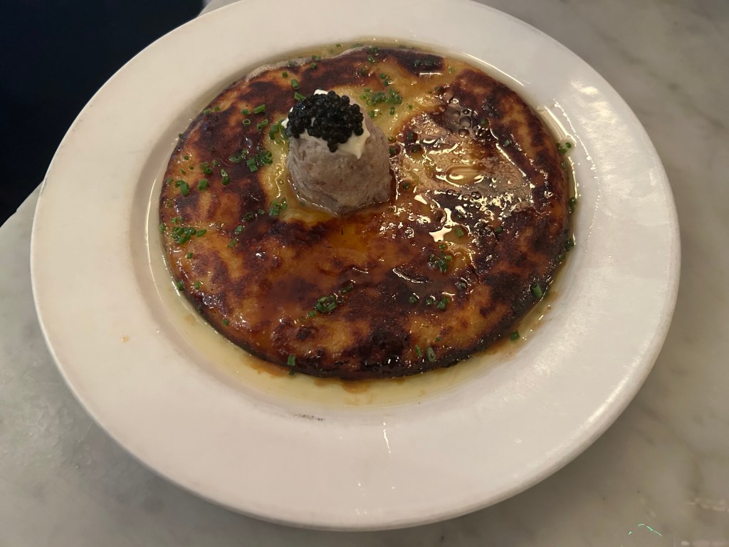 We sat silently, slowly picking away the cake, enjoying the sweet, savoury flavours. The contrast between the honey butter, creamy smoked fish puree and sturgeon caviar was unusual and delicious. L raved that this was the best dish he’s eaten on the trip. He loved the crispy texture and the unique flavour combination.