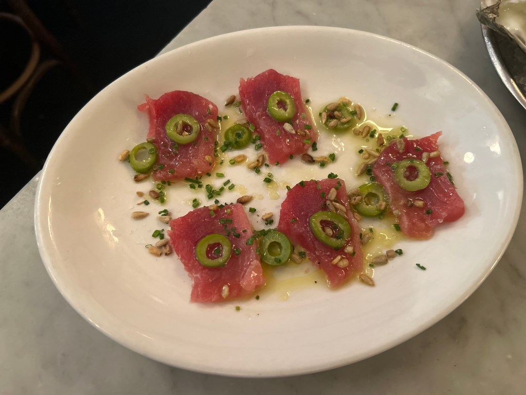 Next, we supped on Bluefin Tuna ($21). The tuna was buttery and smooth, but it was the addition of the crunchy seeds and salt made the crudo pop. I liked the dollop of olive oil and nutty flavour from the sunflowers.