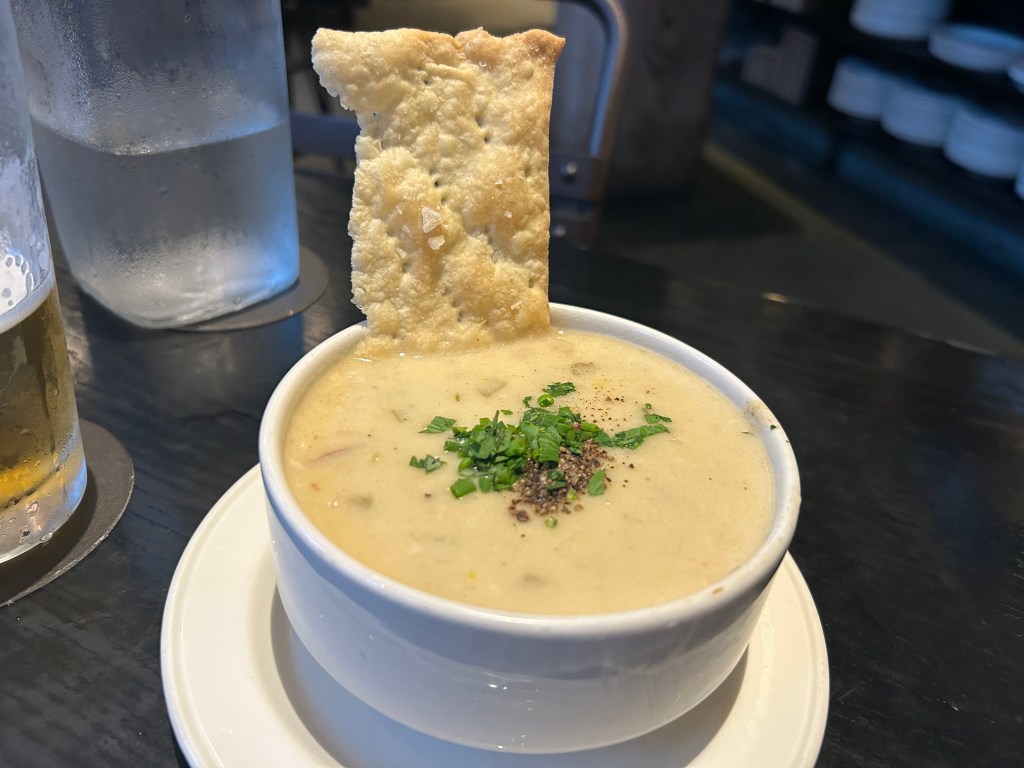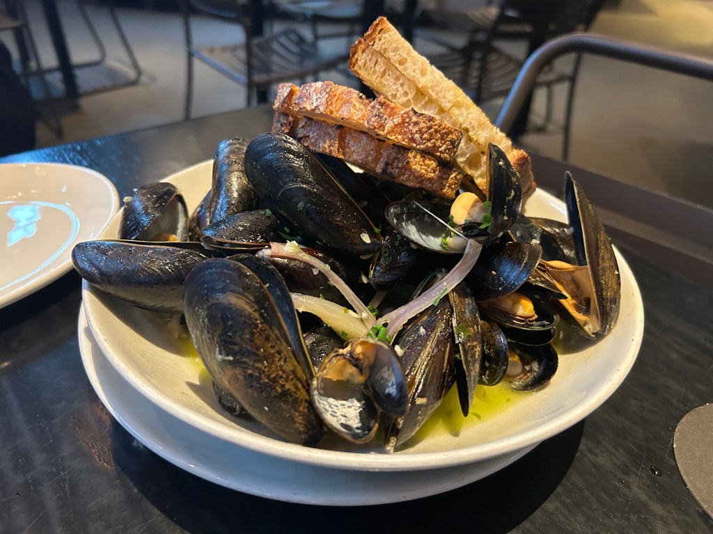We weren’t too hungry and wanted something light to tie us over until dinner. I knew mussels weren’t in season, but I still ordered the Lager Steamed Mussels ($18). L wanted New England Clam Chowder ($13). Our server picked a crisp white wine (Domaine de la Ferrandière, $14) to go with my mussels, and L ordered Rally ($10), a session IPA.
