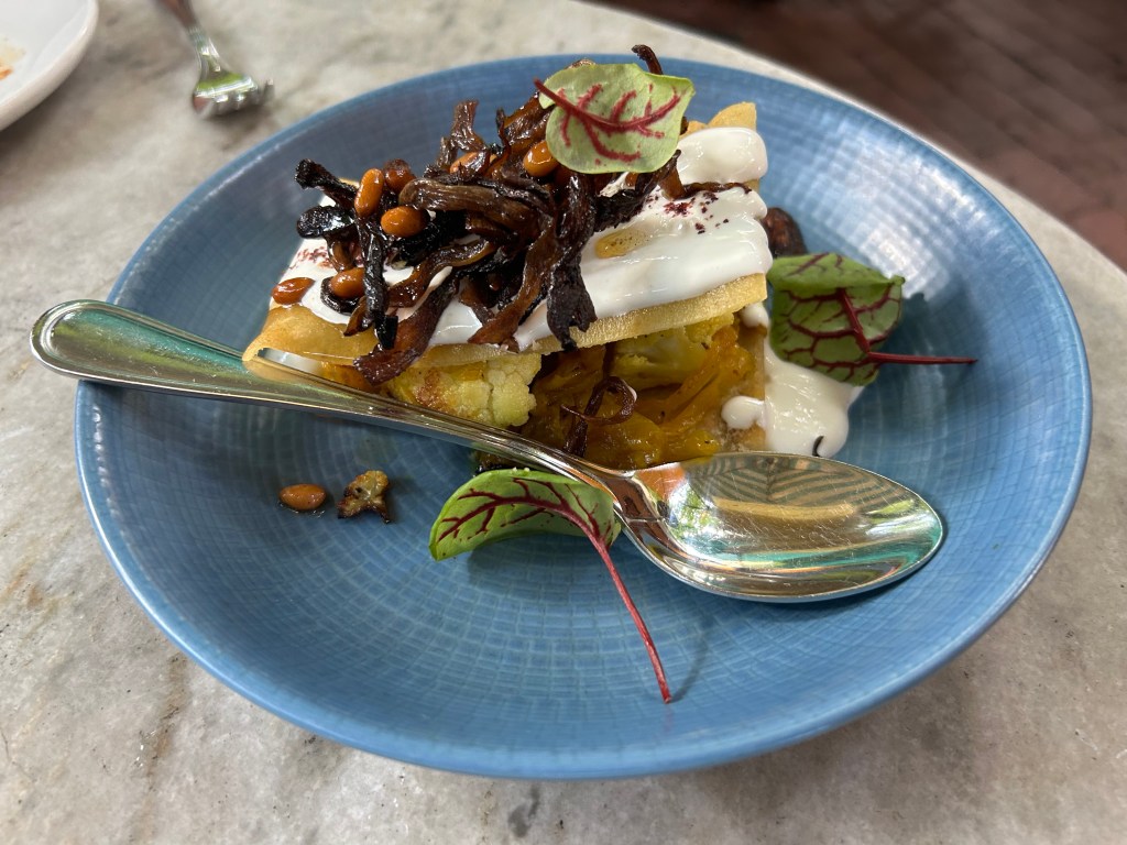 I read several reviews raving about the Spinach Falafel ($15), so I had to order it. We were instructed to roll each falafel with the flatbread and greens. I didn’t follow our server’s instructions, and instead, I broke apart the crunchy falafel into pieces, mixing the tahini, sour pickles, pine nuts and tzatziki. The spinach leaves were thick and wild looking.