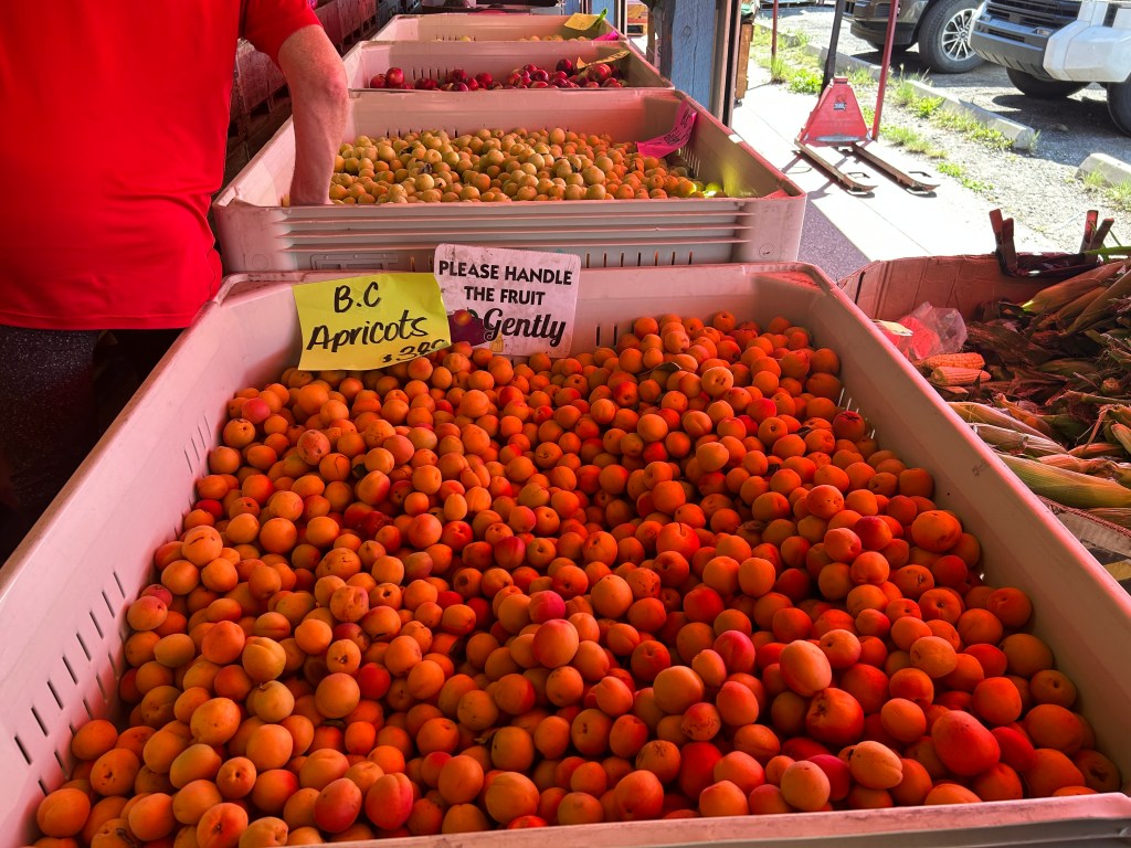 I was in awe when I walked in. There are two fridges full of fancy mushrooms, Hutterite chicken and eggs, sausages, and stands of fresh BC fruit. On the day we visited, I grabbed the sweetest bags of carrots ($3.99), English peas ($7.99), Hutterite chicken thighs ($8) and a flat of eggs ($9). Lululemon picked up mini cucumbers and beans for pickling, dill, a box of blueberries and bags of fruit.