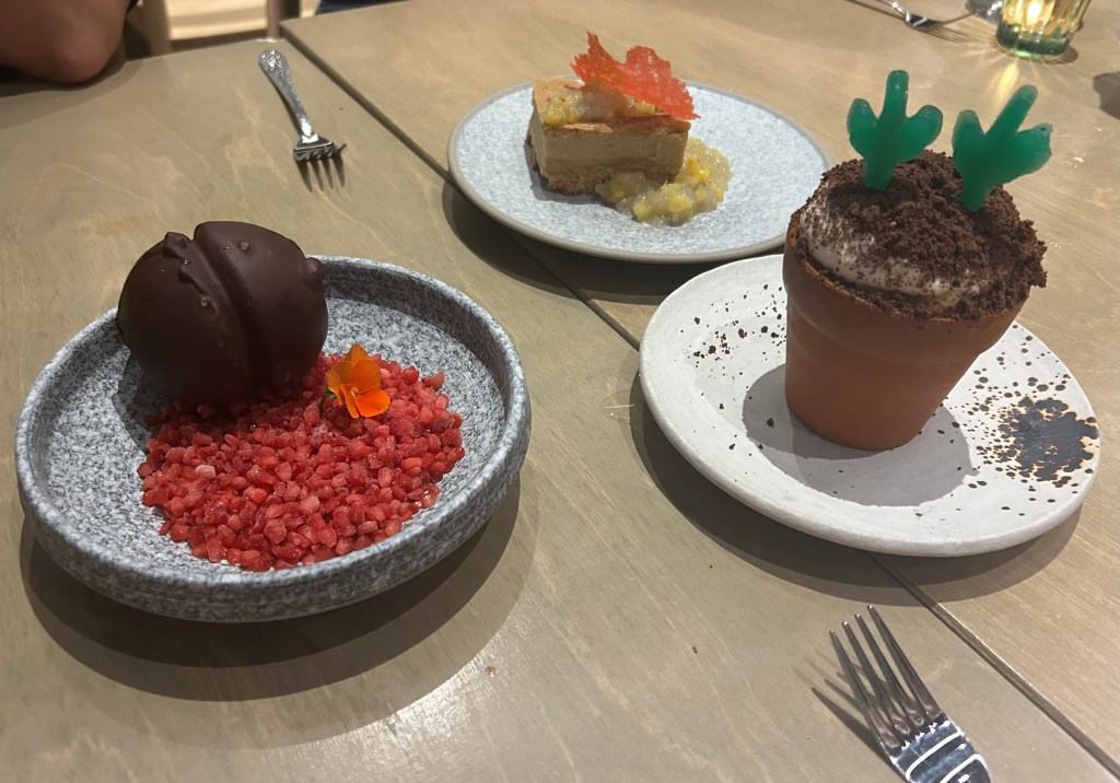 I was curious about the menu, as Kournikova told me her celiac hubby approved of the food. Our server guided us through the menu and ensured we didn’t over-order. We picked the coconut ceviche ($15), queso fundido ($17), el pastor ($45), pulpo al chentextle ($30) and for dessert, we requested all three cakes.