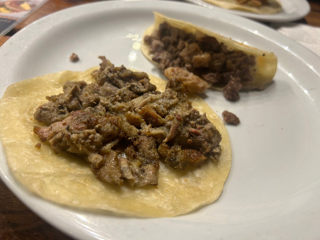Our go-to evening spot is La Lupita for the service, ambience, live music and some of the best chorizo and al pastor tacos. The chorizo is a flavour bomb – crunchy from fried pork skin and juicy from the homemade sausage. I ordered two chorizos, and the second proved too rich even for me. Except for the al pastor, most of the tacos are two or three times the cost of other places, but the amount of filling and creativity in each dish makes it more than worth it.