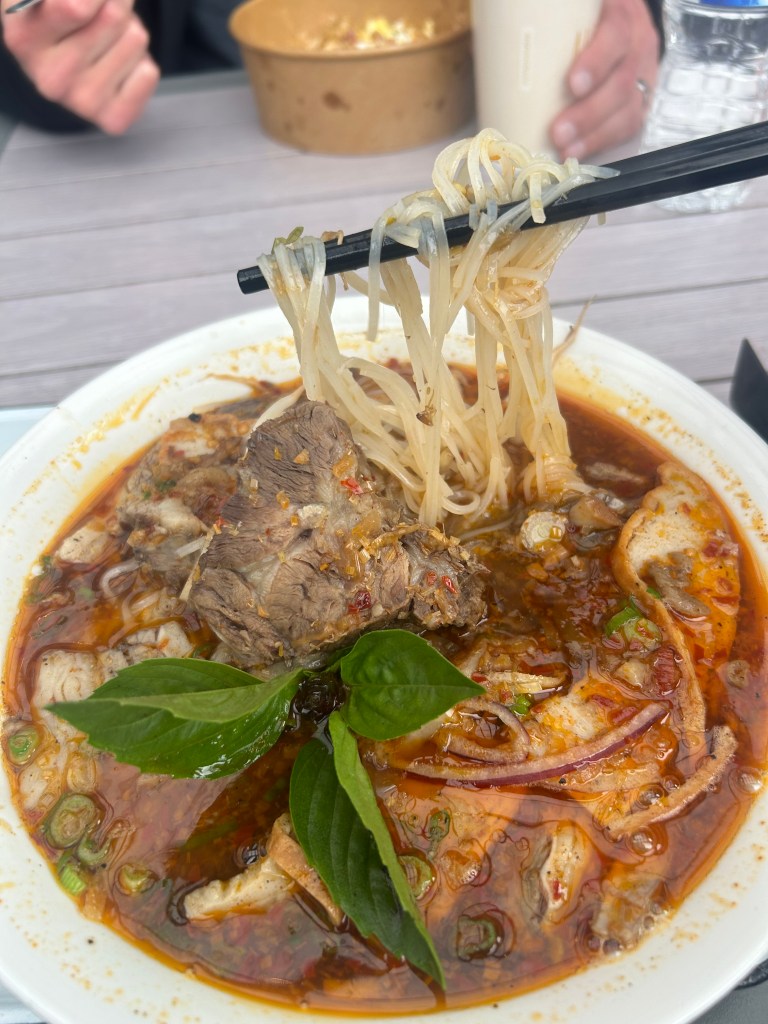 I suggested First Street Market because we wouldn’t have to wait in line, and there are traditional breakfast items and things I like to eat, like pho, dosas, and tacos. Freedom went to Friends with Benedicts, Nightengale bought a sandwich from Alforno, and Hammer bought a rice bowl from K-Town Fried Chicken. Despite the long lineup at Friends with Benedicts, Freedom picked up his food rather quickly. Hammer enjoyed her crispy soy garlic tofu bowl and recommended that next time, I try the new Korean stall. Nightengale carefully ate her messy sandwich, which dripped with white globs of fior di latte. I’ve been craving pho for months, so I went to Pure Street Food when I saw the owner, Lam Pham, was at the helm of his restaurant.
