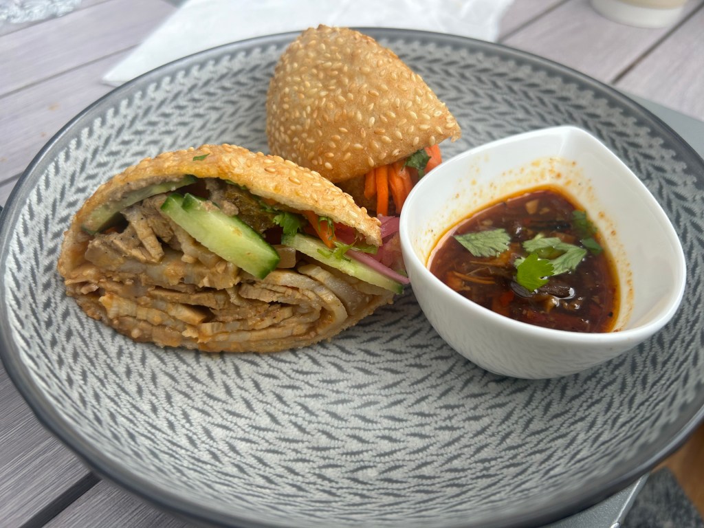 Near the end of our meal, Lam came over to our table and dropped me off a treat—his special sesame donut with pork belly and pork crackling ($8). I was already so full of my pho, but the fei poi in me couldn’t resist such a gift. Each donut half was stacked high with soft layers of pork belly, pickled carrots, cucumber and sriracha aioli. At the back of each donut was a light, crunchy crackle from the pork. Each bite was decadent, heavy from the sauces, and sweet from the thin sesame shell, like a savoury dessert.