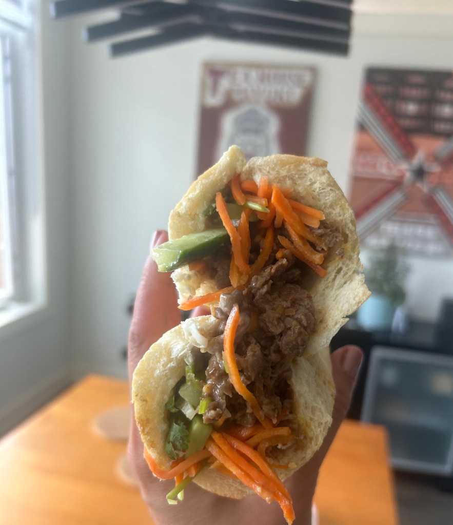 I took a bite of Chew Steel’s beef sate. The beef was saucy with a pleasant heat, and I loved the prominent lemongrass flavour in the soft meat. Chew Steel mentioned the bread was light and didn’t cut into the roof of his mouth. I was impressed with the amount of beef. I would get this again.