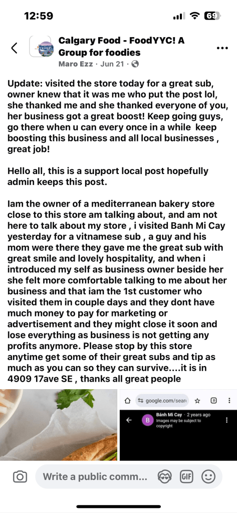 I remembered a Facebook post by Maro Ezz who owns a Mediterranean bakery near Banh Mi Cay. Maro came in to order a banh mi and chatted with the owner, who mentioned business was slow. Concerned and wanting to support her, he wrote about the friendly service and excellent food and recommended that other people check it out.