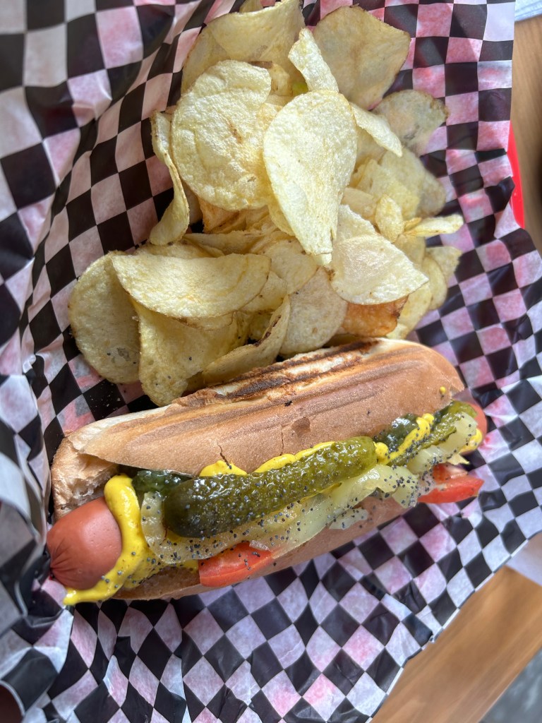 We ordered a vegetarian Chicago Doggo ($11) with chips and some beer.