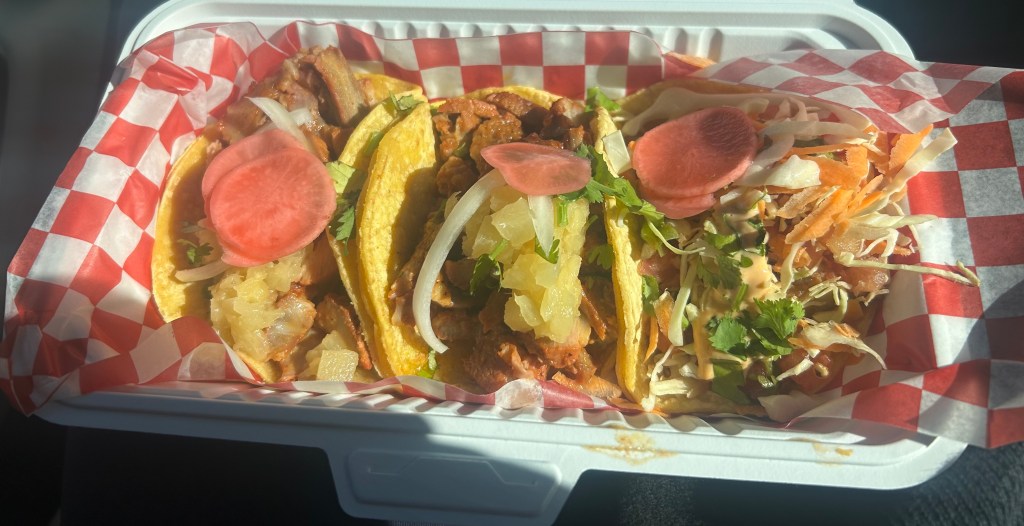 Yesterday, after my appointment, Chew Steel surprised me with food from Don Tacos. We sat eating in a parking lot because, with tacos like these, you got to eat them while they were fresh. You know it’s a good meal when you’re willing to eat it in the car.