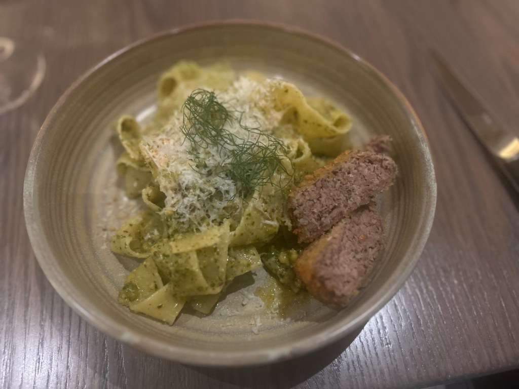 Betty ordered the Pappardelle ($28) topped with Crispy Duck Confit ($8). The thick, ribbon-like noodles had a delightful chew, coated in a mix of ground nuts, basil, and cheese instead of a traditional sauce. Kournikova wasn’t a fan of the duck confit, finding it dry. I didn’t try the duck, but I thought the pasta was yummy.
