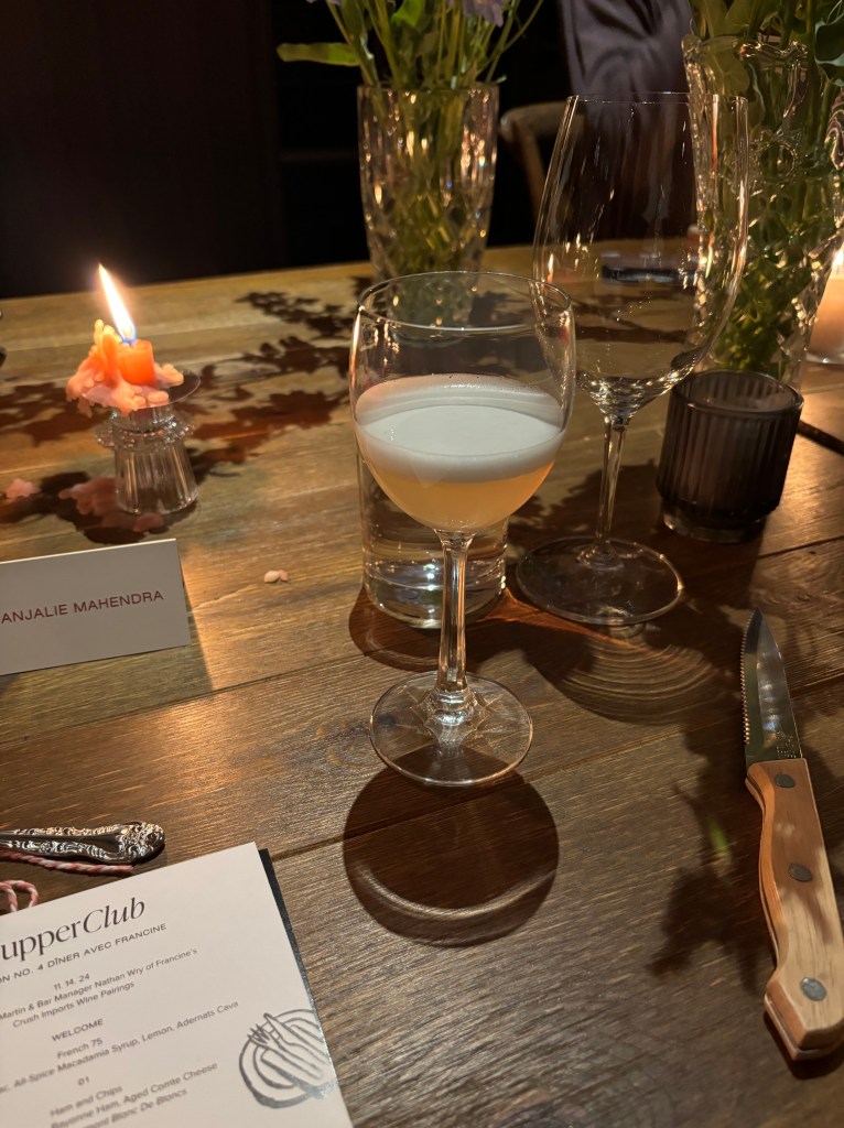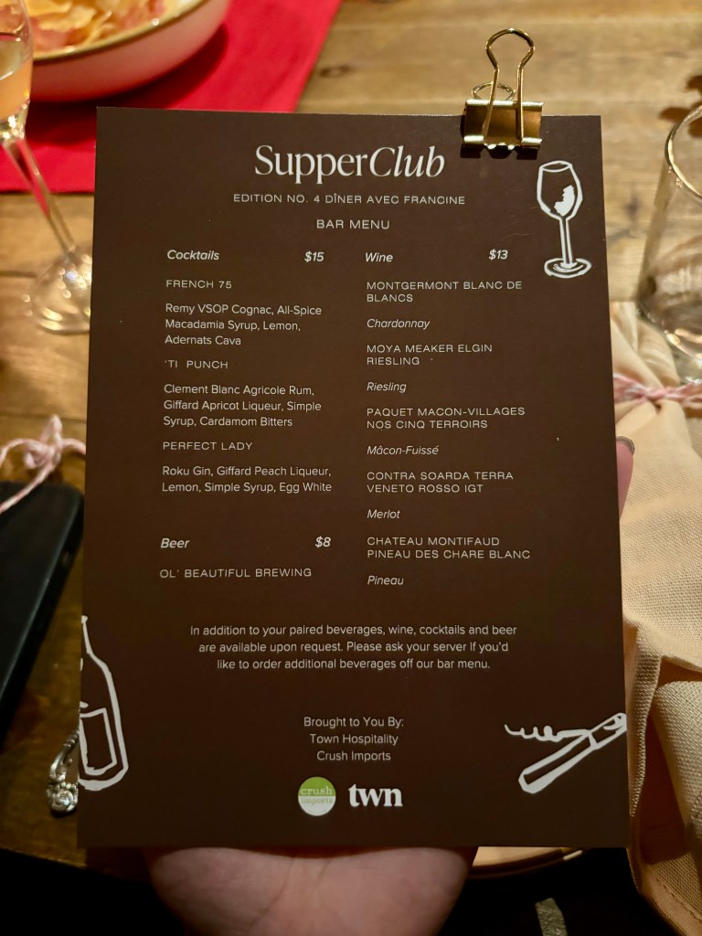 Divine Offering noted the cocktails made by Sugar Water Bar were expertly timed throughout dinner. The French 75 stimulated her appetite, while the ‘Ti Punch, her favourite cocktail tonight, ended the dinner perfectly. Nate noted that he prefers to use French spirits, such as French rum, and simple garnishes with the cocktails to focus on the taste. The last drink was funky and fun, fragrant and had a real “punch” to it.
