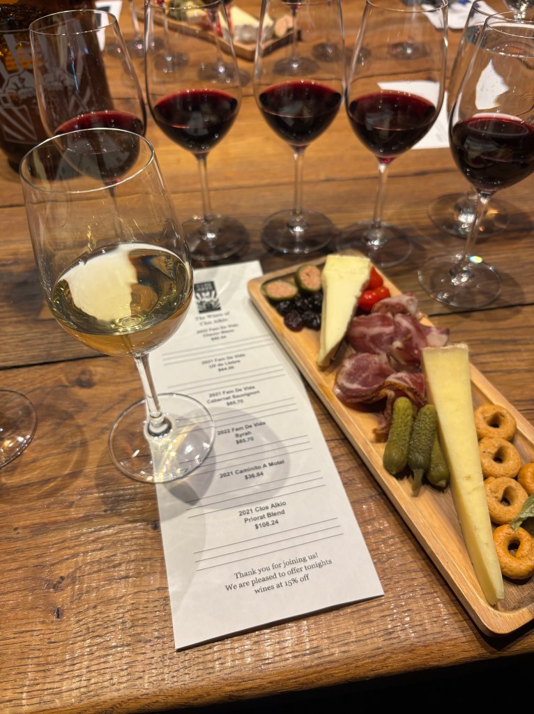 Mikko clearly favoured the fourth tasting – Fam de Vida Syrah 2022 ($88.70). This wine is aged in French oak for 14 months. He recommends tasting the difference after ten hours and then again the next day. I’m an impatient drinker, so this bottle was a no-go for me to purchase.