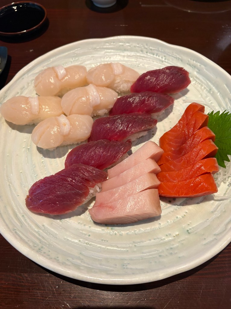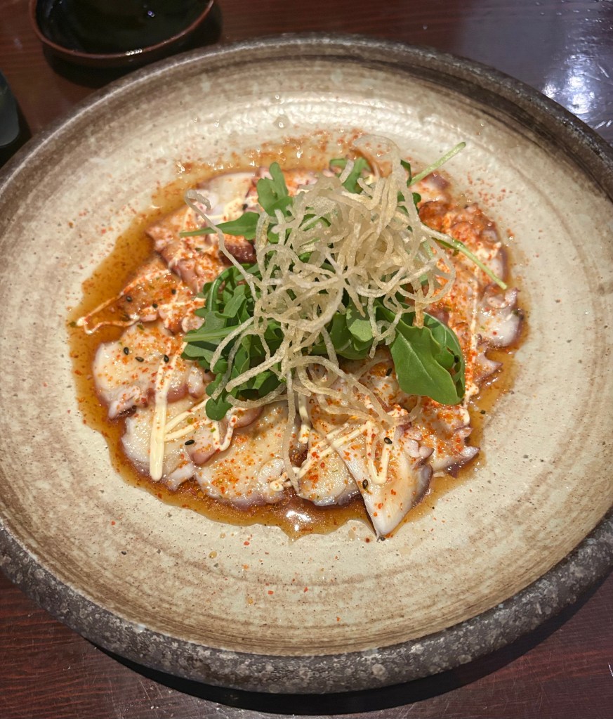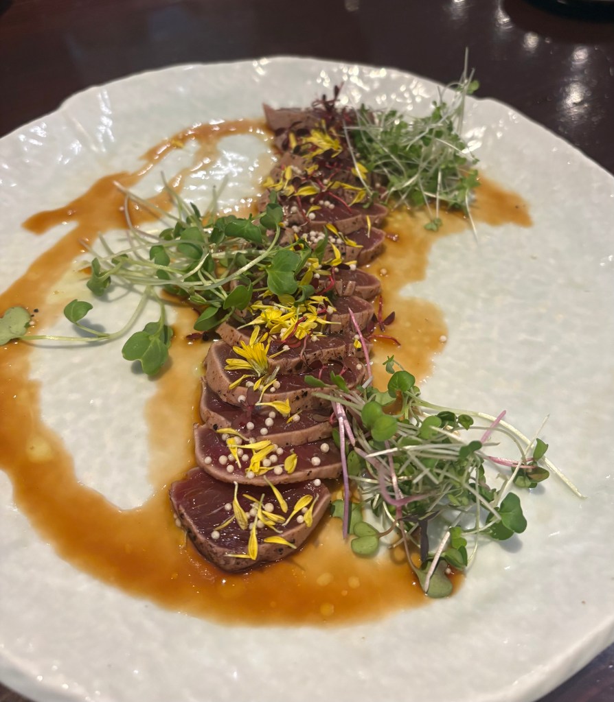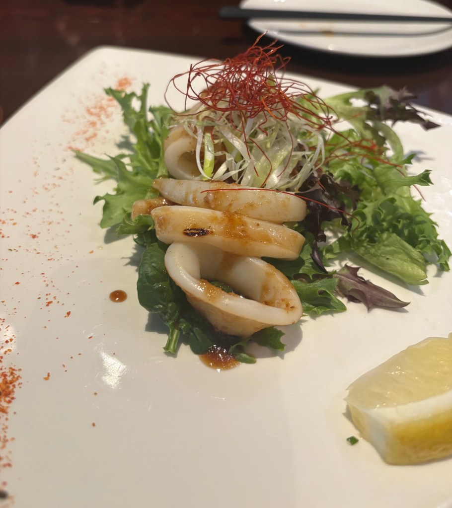 I ordered a range of appetizers. First up was Roblox and Jellybean’s favourite dish: seared tuna tataki. The tuna was delicate and soft, which contrasted with the crunchy garnish. Jellybean thought the sauce tasted like a juicy orange. Roblox said the tuna tasted like the inside of sashimi. Jellybean leaned in and said, “This is the best thing I’ve eaten the whole trip.”
