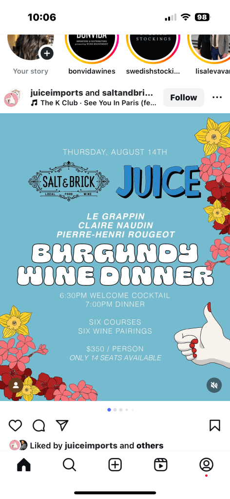 A recent health development has kept me mostly at home over the past few weeks. However, I’ve been punctuating my sad little existence with the occasional jaunt. For example, I prebooked a Vine Arts wine tasting ($50) with Erik Mercier from Juice Imports before I was diagnosed, and I figured going wouldn’t literally kill me, so I went. Let’s listen to ‘Edelweiss’ for this post.